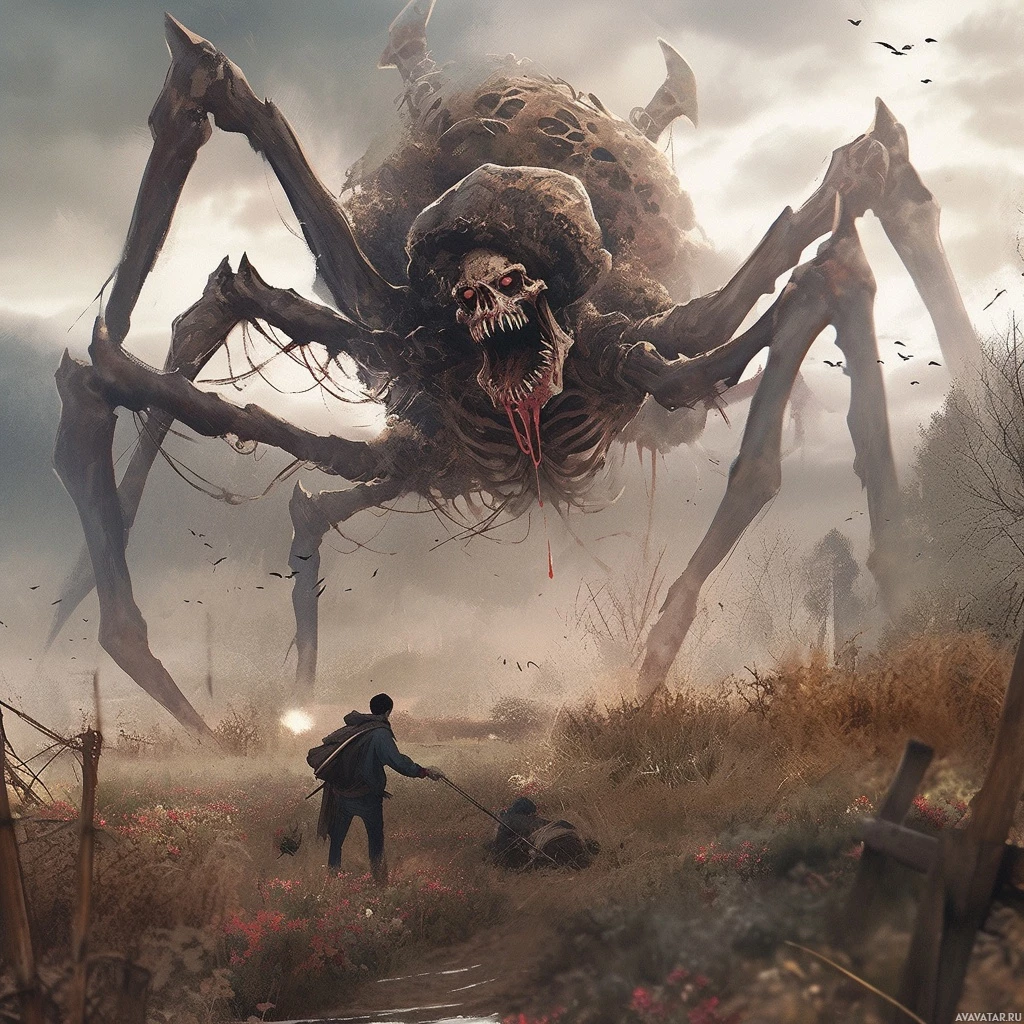 This image depicts a terrifying scene with a large, monstrous spider that appears to be