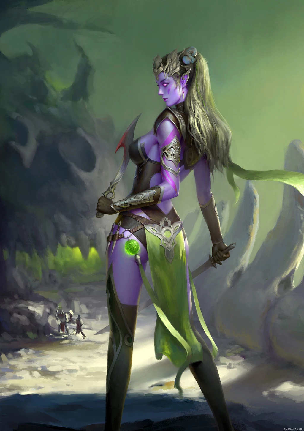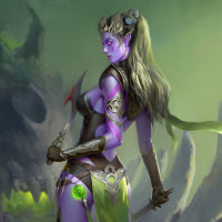 high fantasy attire, with purple and green elements, which are common colors associated with drow characters. The character is holding what looks like a dagger or small sword in one hand while the other arm is resting by her side. The setting suggests a dark and mysterious environment, possibly a cave or