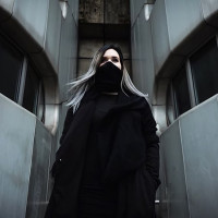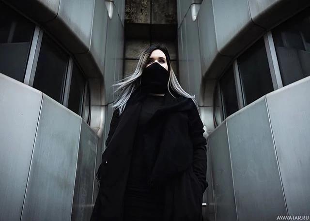 a long coat and has their face partially obscured by a mask, suggesting a modern, edgy style that may align with the term "girl" used in this context. There's a digital