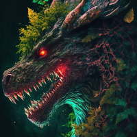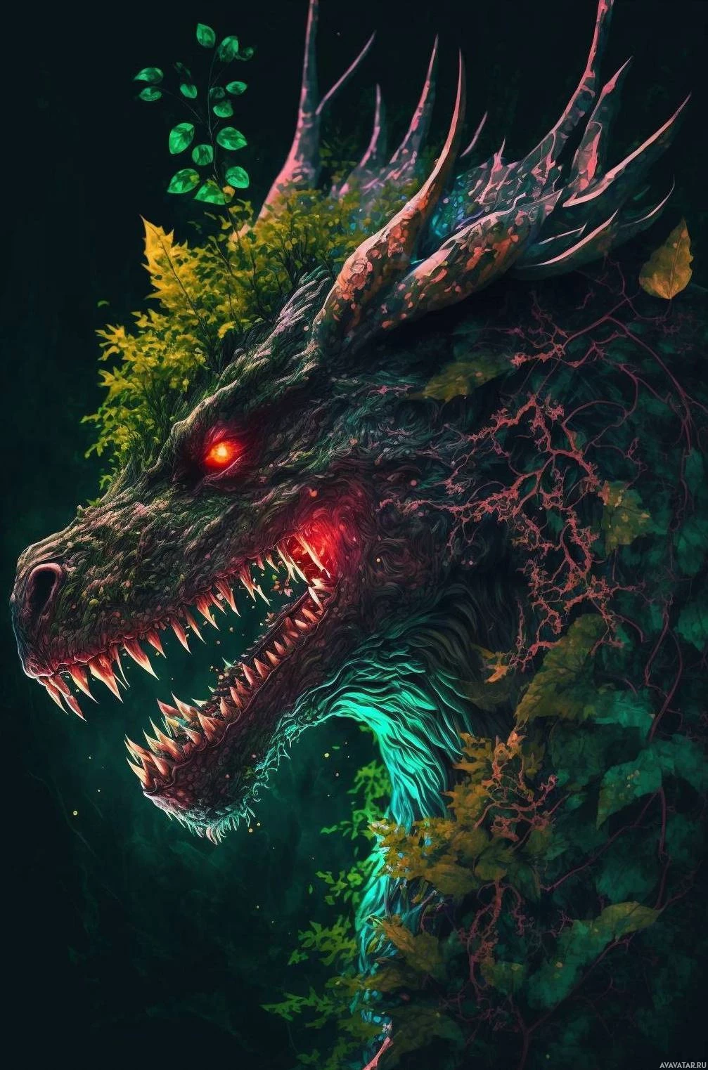 sharp teeth and is surrounded by vibrant green foliage and leaves, suggesting an environment rich in plant life. The dragon's body is adorned with intricate patterns resembling tree branches or roots, integrating it visually into