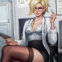 a blonde girl wearing glasses, dressed in a doctor's outfit that includes a white lab coat. She is sitting at a desk with her chin resting on her hand, which suggests she might be deep in thought or assessing the details of