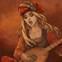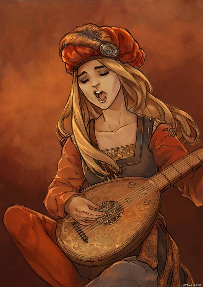 blonde hair and is wearing period-style clothing, including what looks like a feathered hat. Her eyes are closed, suggesting that she might be in the middle of playing her instrument or deeply immersed in her performance. The style of the image could suggest it's related to "The Witcher"