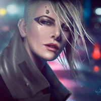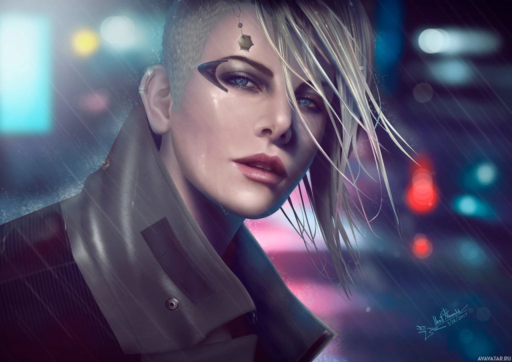 female character with short hair and striking features. She has visible piercings on her ear and what appears to be a tattoo near one eye. The character is depicted in