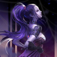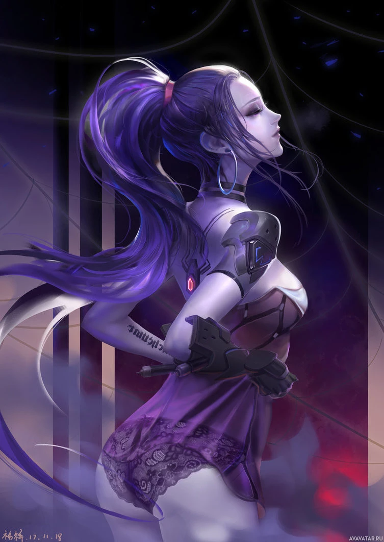 an illustrated character, a female with purple hair styled in a ponytail. She is wearing what appears to be a black and red dress or top. There are web-like patterns in the background, suggesting she might be in a spiderweb-themed environment. The art style suggests it could be from an anime or manga series, given the stylized features and character design.