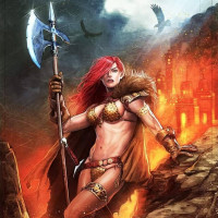red hair, holding an axe. She is dressed in what appears to be armor or