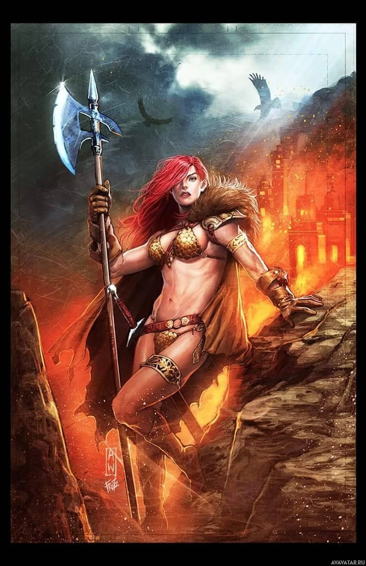 battle gear, and she is set against a fiery background that could represent war or battle. There are also elements such as a cape and a helmet, which add to her warrior-like appearance. The image is likely created to depict a strong