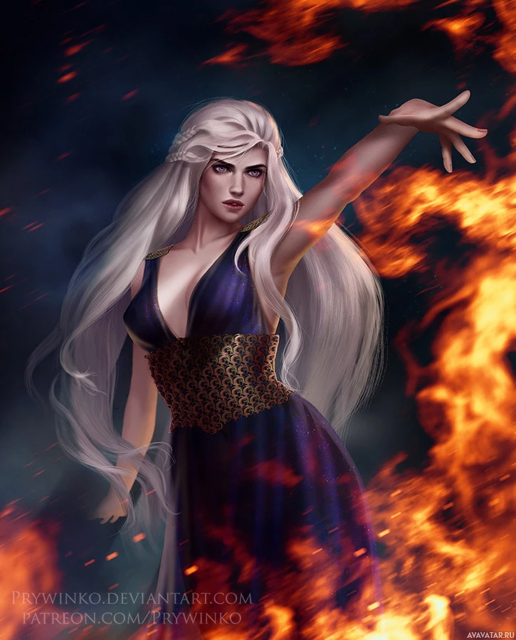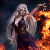 conjuring magic, as indicated by the flames at her fingertips. The artwork is detailed and could be associated with