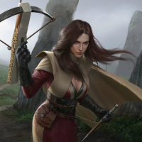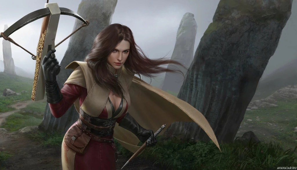 На картинке изображен женский персонаж с длинными каштановыми волосами, одетый в красный и золотой плащ. У нее арбалет в правой руке и она нацеливается на то, что не видно на картинке. Место действия, кажется, находится на открытом воздухе с каменистым ландшафтом и тем, что выглядит как туман или туман на заднем плане.