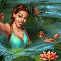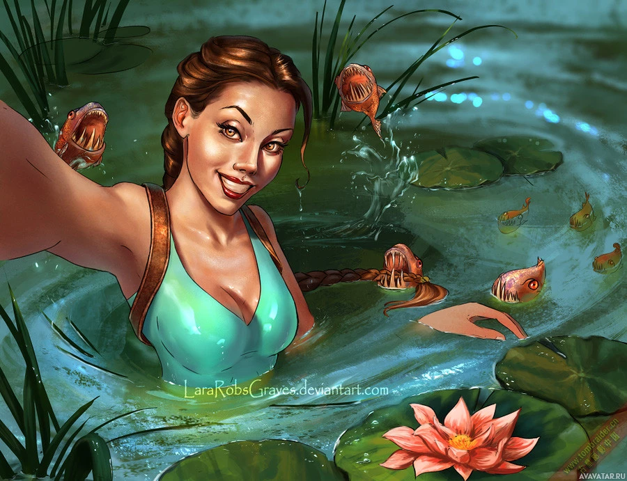 a body of water with lily pads and is surrounded by fish, which seem to be piranhas based on their appearance. The character is smiling broadly at the camera, capturing