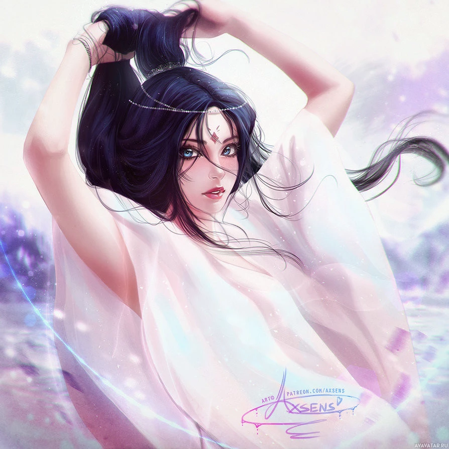 historical setting. Her pose suggests movement or dance, as one arm is raised above her head and the other extends downwards. The background has a soft, ethereal quality, with light streaks that give it