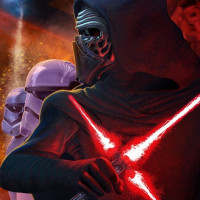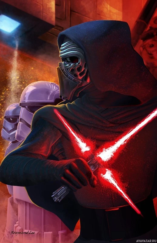 the Star Wars franchise, Kylo Ren. He is depicted in a pose that suggests he is holding his lightsaber ready for combat. In the background, you can see another character, likely from the same universe, who appears to be equipped with armor indicative of the Imperial or