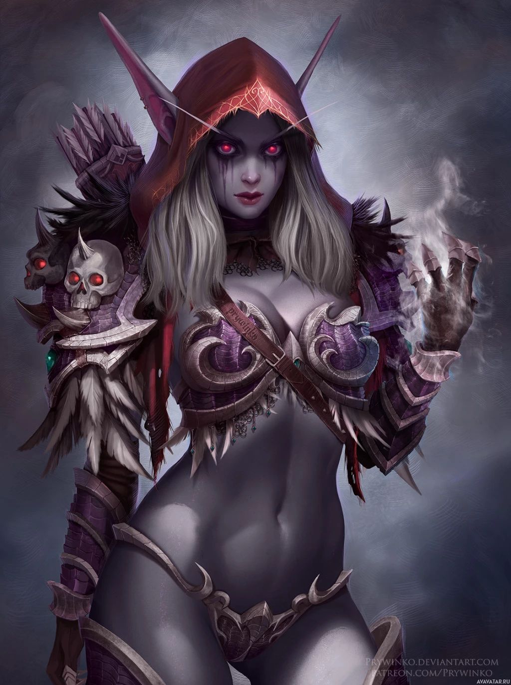 the Warcraft universe, specifically resembling Sylvanas Windrunner, who is portrayed as a powerful drow elf in fantasy context. She is depicted with dark skin, pointed ears characteristic of her species, and has striking