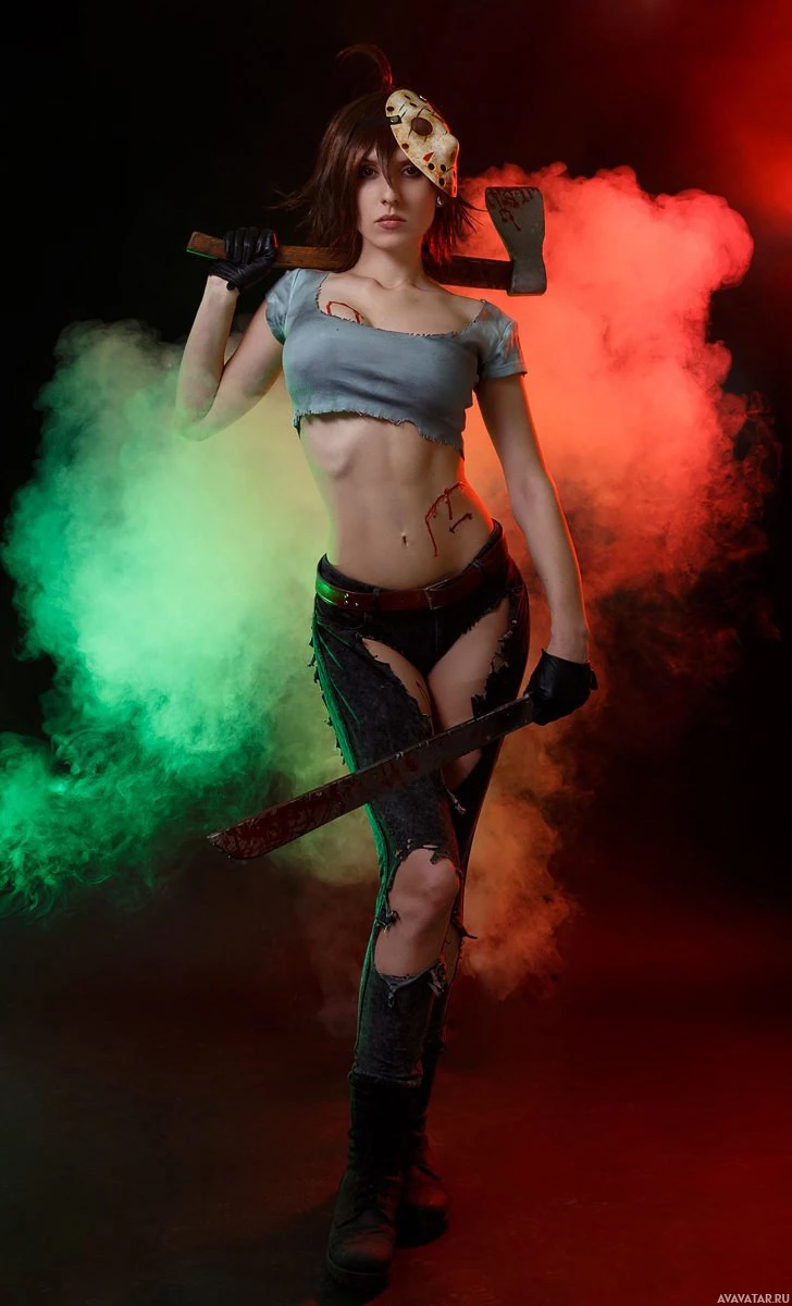 Jason Voorhees from the "Friday the 13th" series and is holding an axe, which is iconic to the character. There's also smoke or fog being emitted at their feet, which enhances