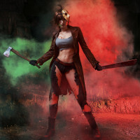 tattered clothing, and holds an axe and machete-like weapon as part of the ensemble. The background suggests a dramatic and possibly spooky or fantasy setting with