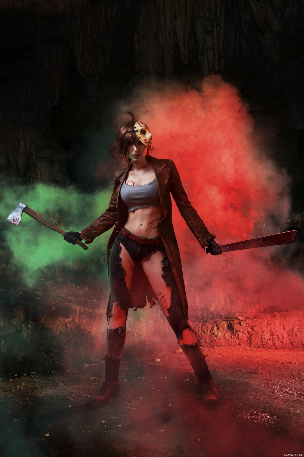 Jason Voorhees from the "Friday the 13th" series. This individual is wearing a costume that includes a mask,