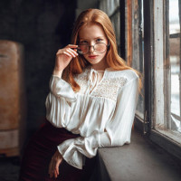 red hair, wearing glasses. She is seated in what appears to be an old or abandoned building, possibly a factory or warehouse setting. She has her hand resting on the windowsill and seems to be gazing outside or into the distance. Her attire includes a ruffled blouse with