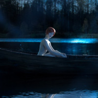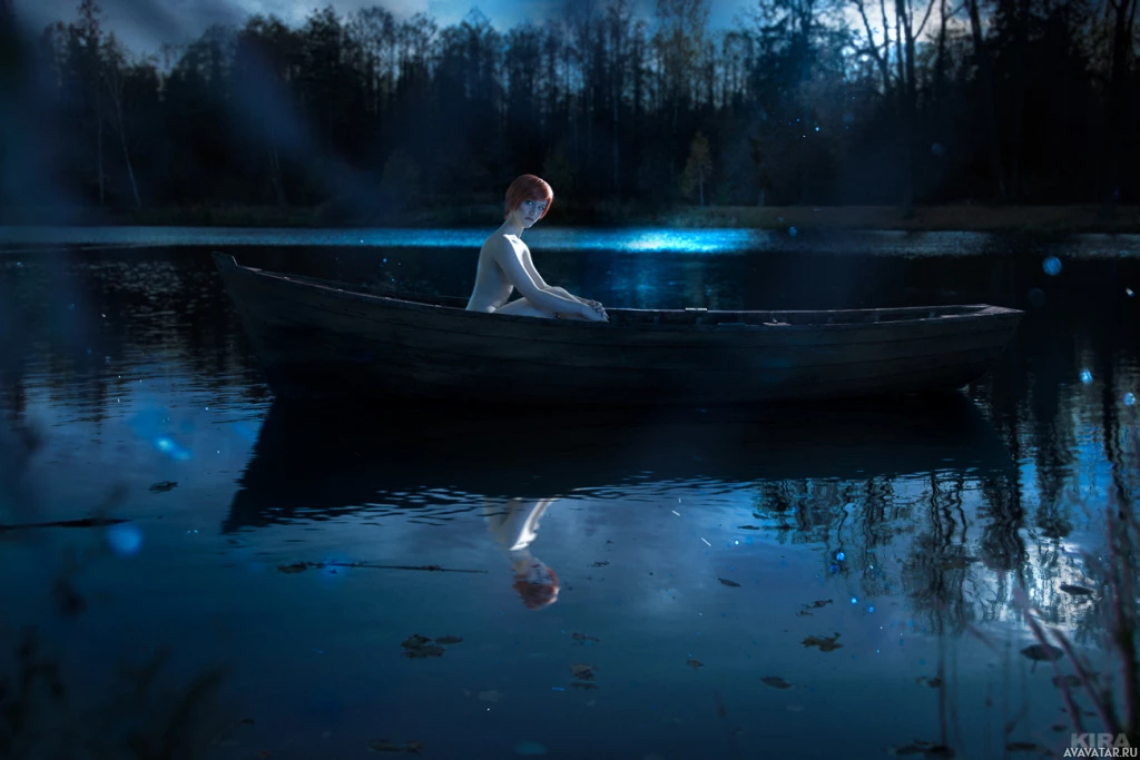 night scene with a person sitting in a small boat on a calm body of water, possibly a lake. The individual appears to be dressed in a costume resembling that of Shani from the "The Witcher" series or similar
