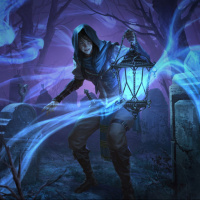 The image depicts a person standing in what appears to be a spooky or mystical setting, possibly a graveyard given the gravestones visible. The individual is wearing a hood and holding a lantern, which emits a pale glow that illuminates their face but casts an ethereal light around them, creating