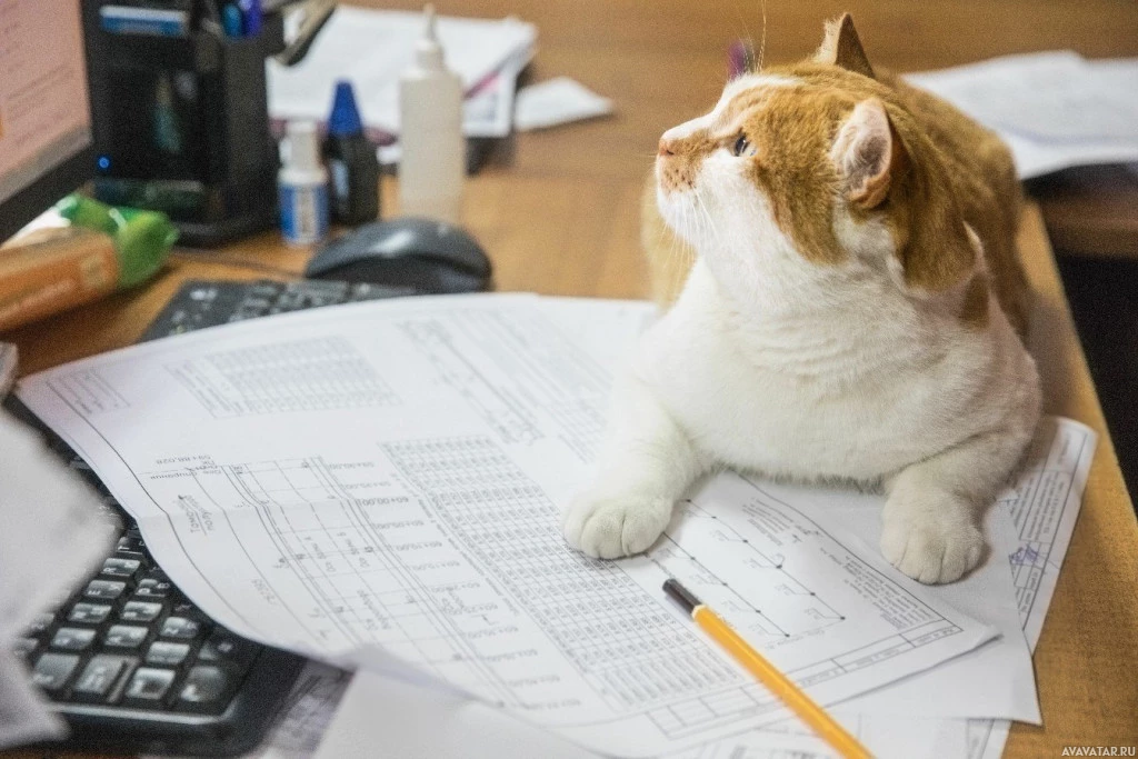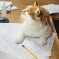 The image shows a cat sitting on top of some papers or documents that are spread out on a desk. The cat appears to be looking directly at the camera, and its paws are on what seems to be a keyboard, possibly indicating it is in front of