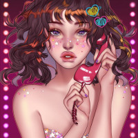 red lipstick and is wearing makeup that includes eyeliner and shimmering effects around her eyes, which could suggest she's in a nightclub or a similar setting. The girl is holding a vintage-style pink phone to her ear, and the background suggests an indoor environment with purple and blue