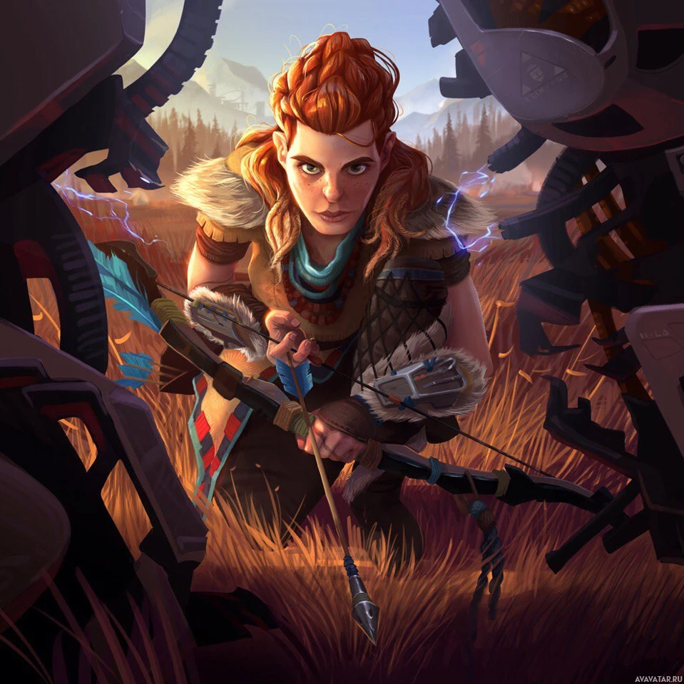 the video game "Horizon Zero Dawn," which is an action role-playing game developed by Guerrilla Games and published by Sony Interactive Entertainment. The character depicted is wearing a fur outfit and holding a bow, suggesting she might be playing the role of
