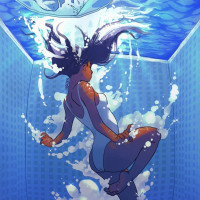 The image shows a girl submerged in water, possibly from a swimming pool or