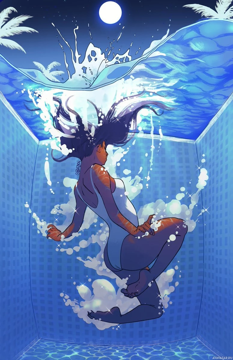 the moonlit sky. Her hair flows freely, indicating movement through the water. The overall atmosphere of the image is calm and serene, with a focus on the interaction between the girl and