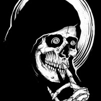 the Grim Reaper or the personification of death. The skull has its eyes closed in a pose that could be interpreted as if it were speaking or singing. This figure is set against a stark