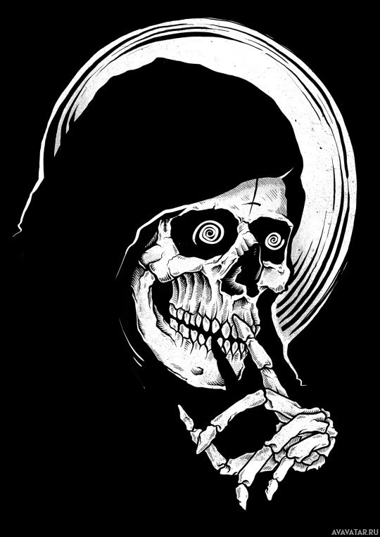 The image depicts an artistic illustration of a skull wearing a hood and robe, which is often associated with