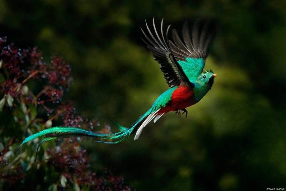 long tail feathers that are spread out during flight. The background is blurred but seems to suggest