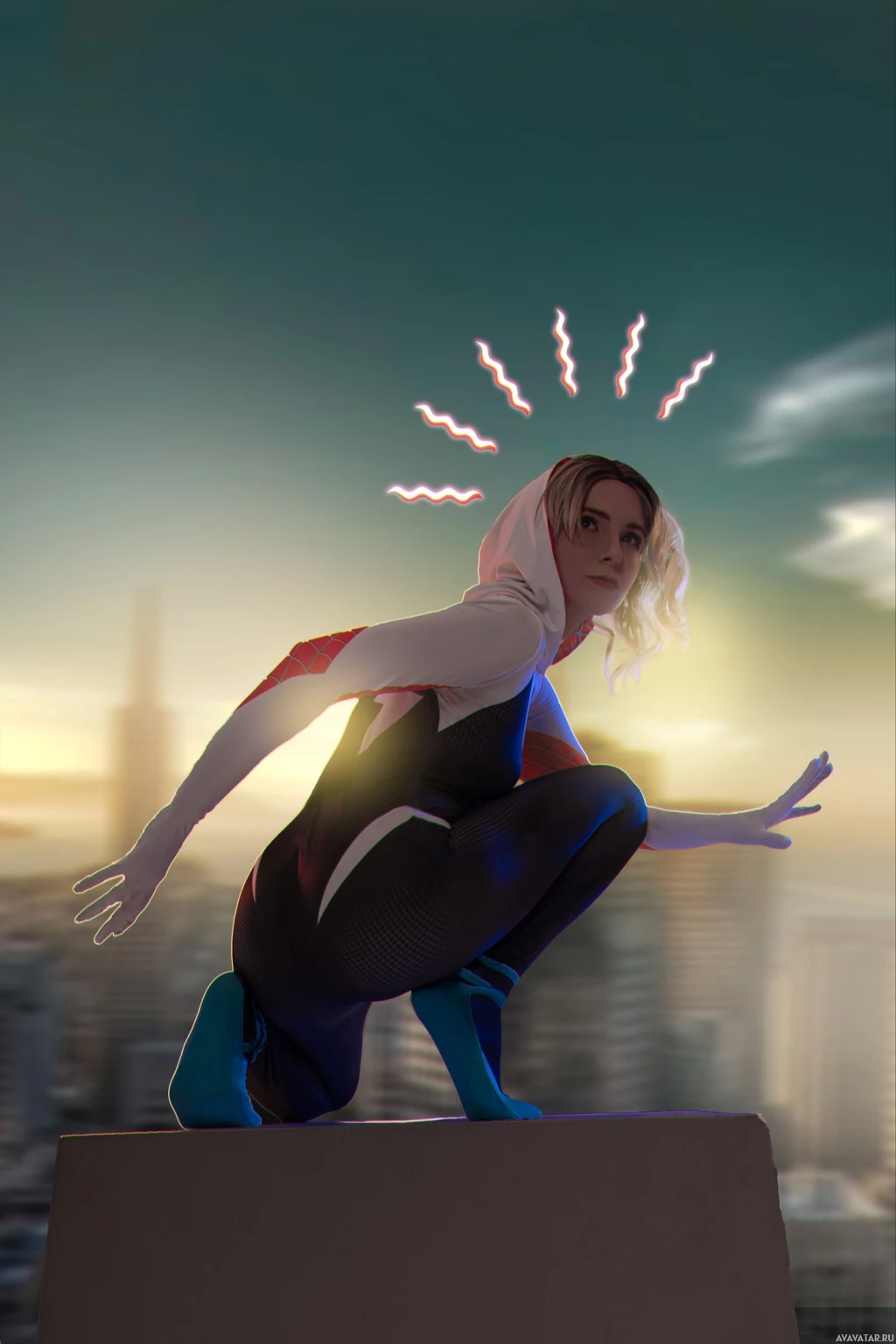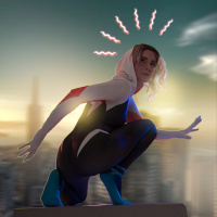 Gwen Stacy from comic book media, known for her role as Spider-Woman. She is shown in