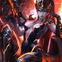 an illustrated character dressed in a fantasy-themed armor and holding what appears to be a weapon, reminiscent of the character Widowmaker from the game Overwatch. The character has