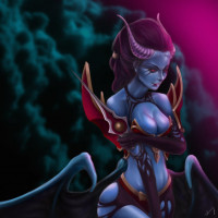 the video game Dota 2. She is shown with a purple skin tone, wearing a red and gold armor with wings, and has horns on her head, giving her a demonic or fantasy appearance.