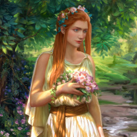 На картинке изображен персонаж с рыжими волосами, одетый в цветочное платье, стоящий среди зеленой листвы. Она держит букет цветов и, кажется, смотрит вдаль с созерцательным выражением.
