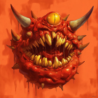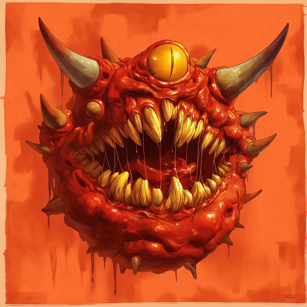 the video game "Doom." It has large yellow eyes, a pair of horns on its head, and