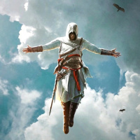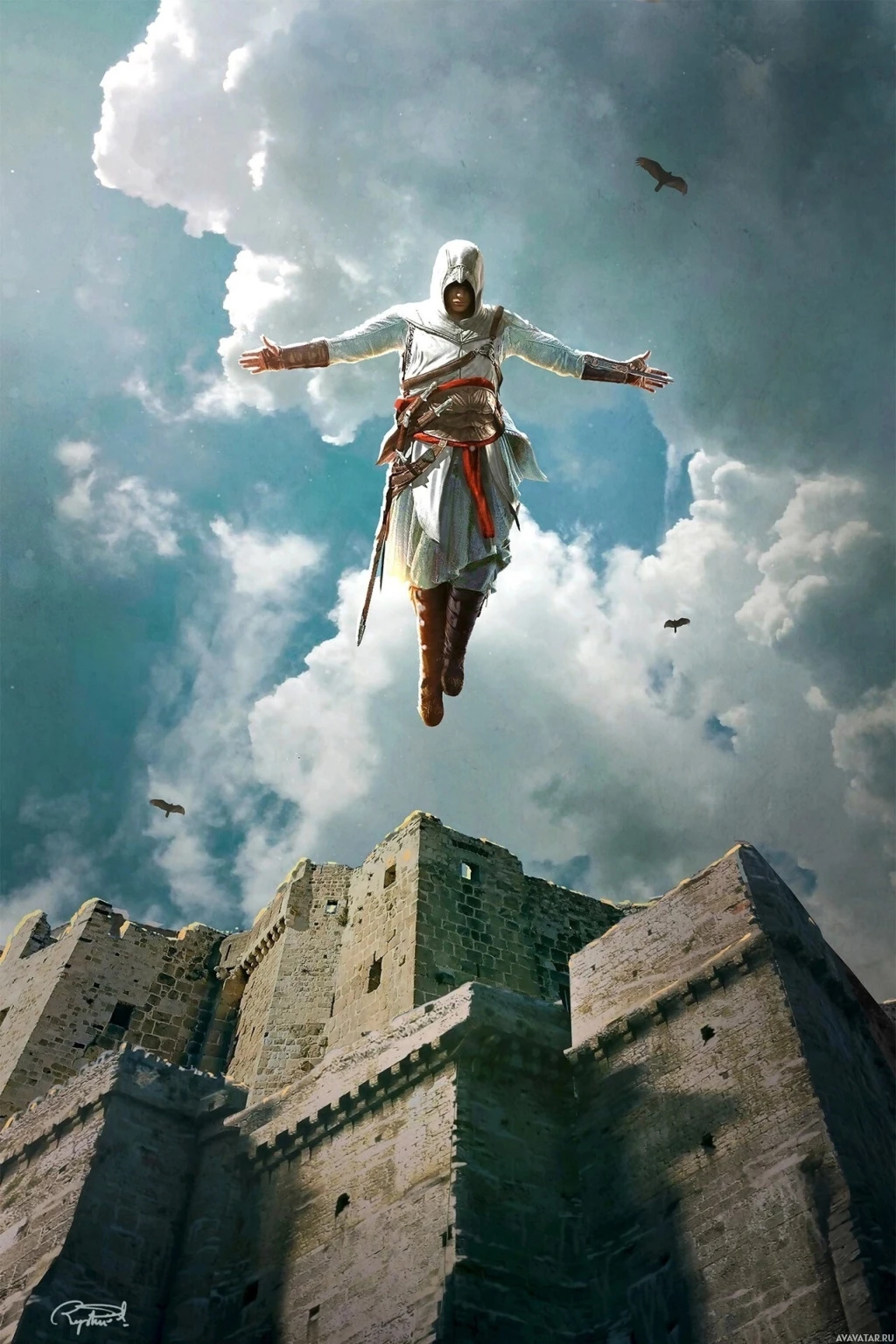 the video game "Assassin's Creed," who is captured mid-air during an acrobatic leap, with their arms outstretched and holding what appears to be a weapon. The character is set against a backdrop that features a castle-like structure, suggesting a scene of historical or fantastical architecture. In the background, there are birds flying, contributing to