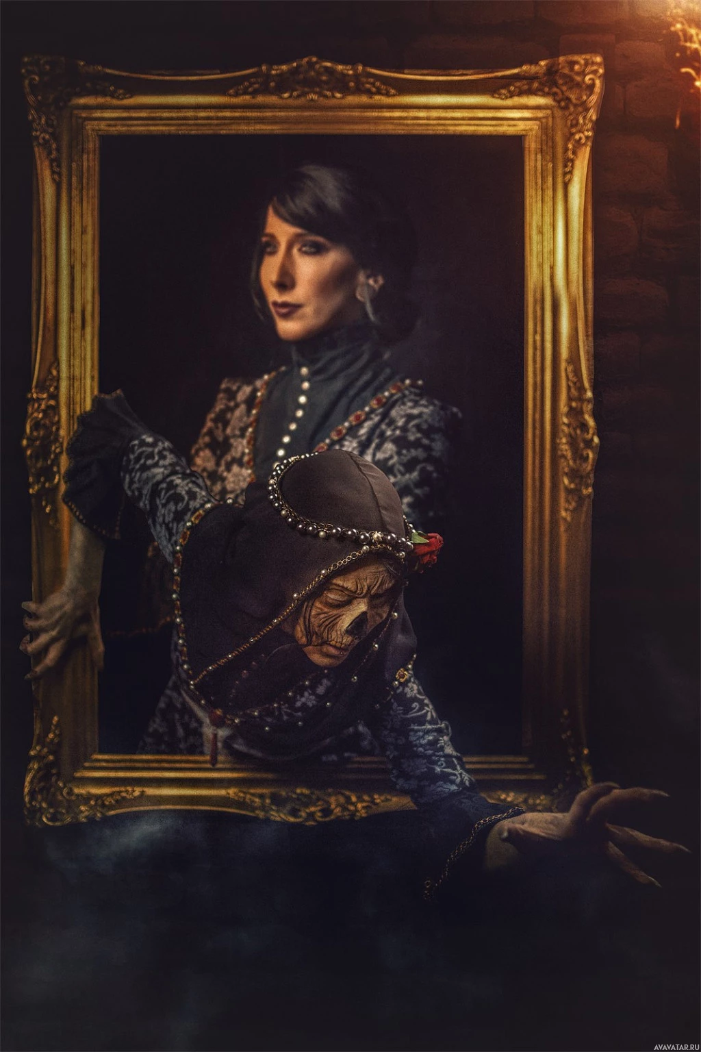 game series. She is wearing a hat and holding what appears to be an old-fashioned portrait of herself within