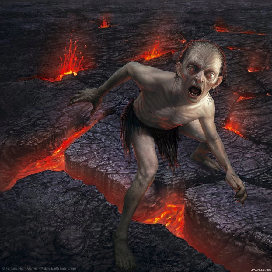 a malevolent character that resembles Gollum from J.R.R. Tolkien's "The Lord of the Rings" series. This character is standing on what appears to be