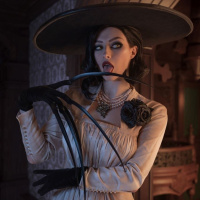 the video game "Resident Evil Village." She is wearing a black top hat, gloves, and has long