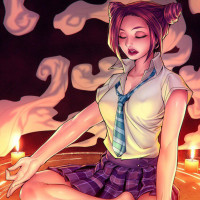 a meditative pose, with her eyes closed and hands placed on her thighs or knees, indicating she might be practicing mindfulness or meditation. Surrounding her are lit candles that cast a warm glow and emit wispy smoke, adding to