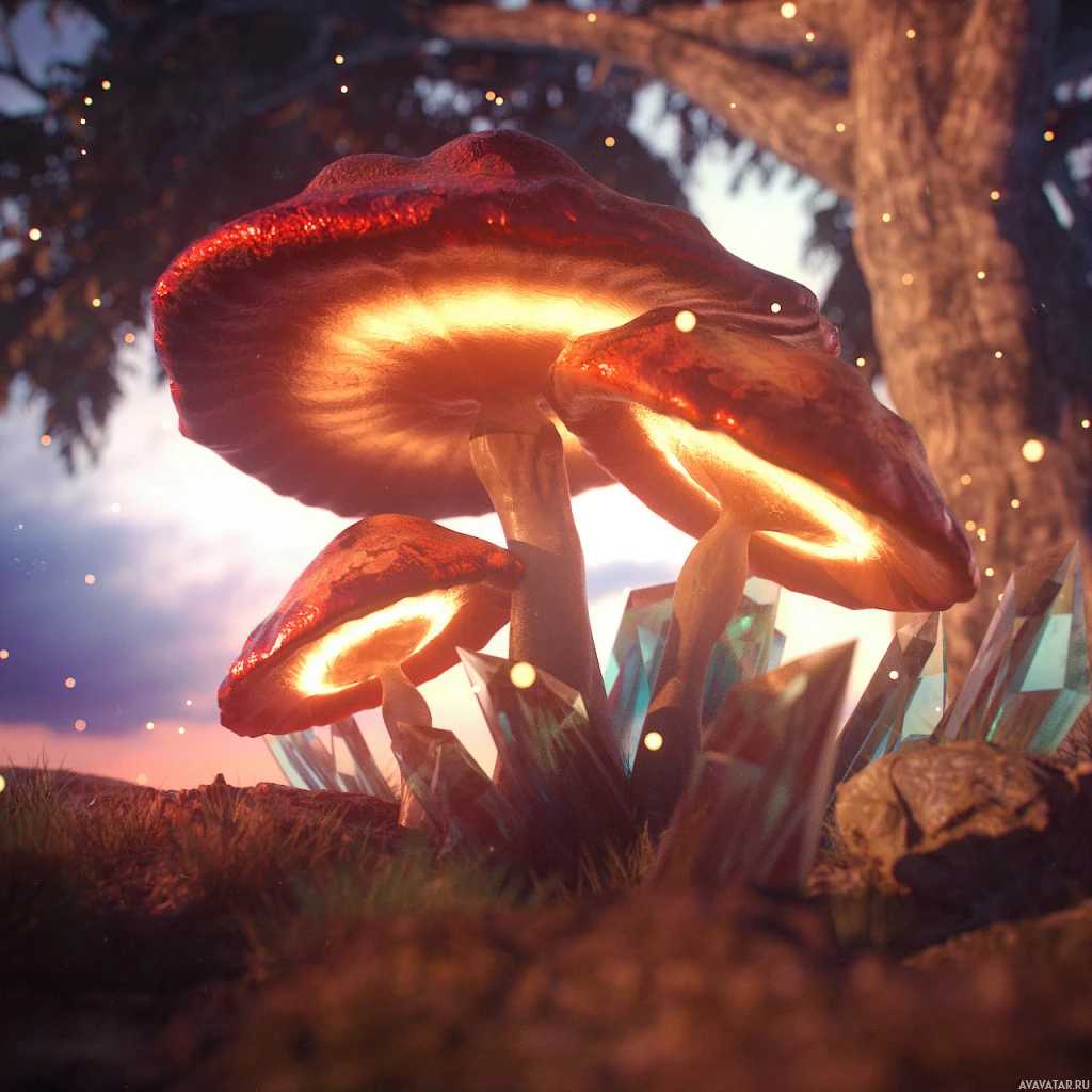 a fantasy scene with several mushrooms in the foreground. The most prominent mushroom has a bright,