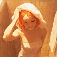 red hair and is wearing a towel wrapped around her body, which suggests that she might be either taking a shower or getting ready to take one. Her expression seems relaxed, with a smile on her face, indicating she is enjoying the moment. The style of animation appears to be quite detailed and realistic, especially in terms of