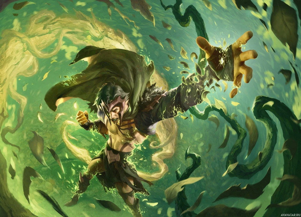 Картинка показывает фантастическую сцену с эльфийским персонажем. Персонаж одет в плащ и окружен динамическим фоном, который предполагает движение или отливку магии. Есть также элементы, такие как листья и кружащаяся энергия, которые способствуют волшебной атмосфере произведения искусства.