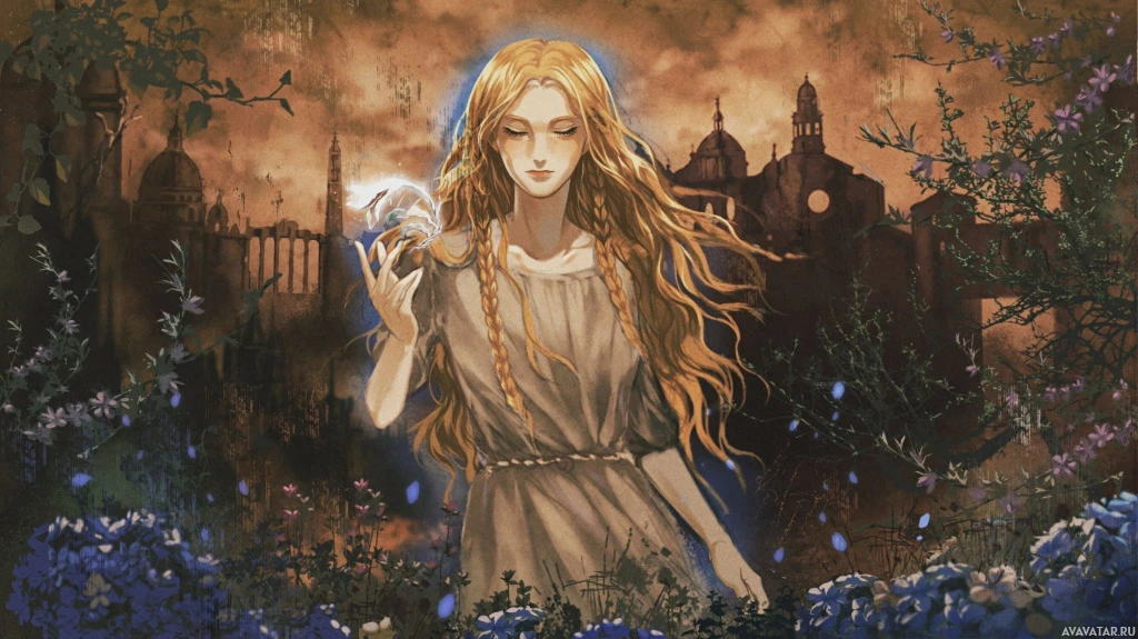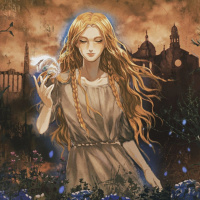 blonde hair and is holding a small, glowing orb in her hand. Her attire appears to be somewhat ethereal or otherworldly, suggesting she may be a character from
