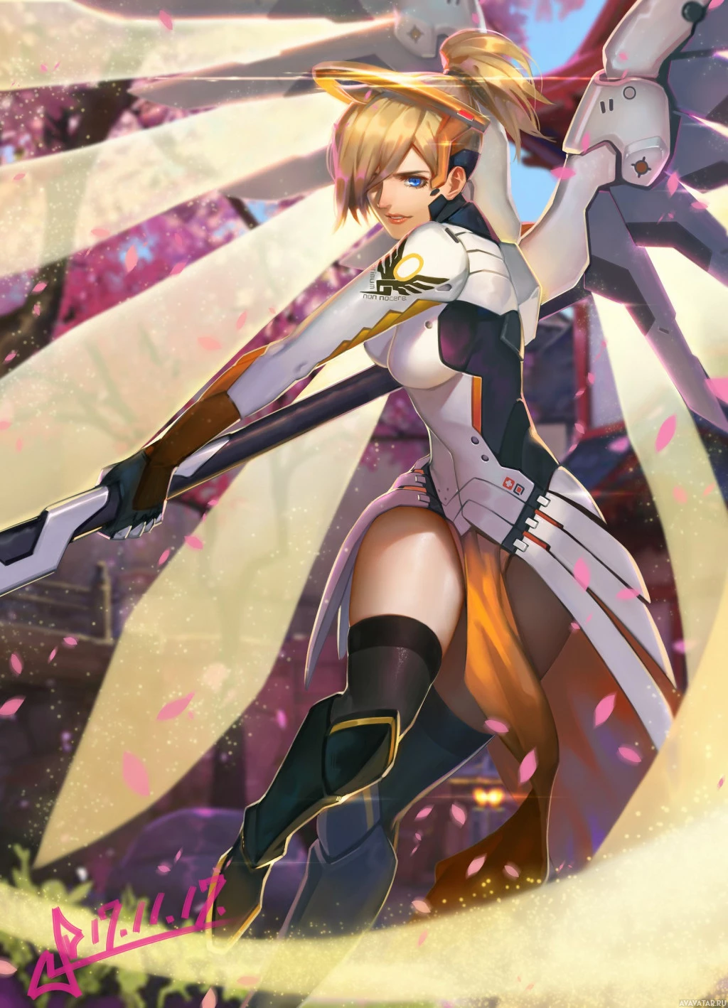 The image features an animated character that appears to be Mercy from the game "Overwatch." She is depicted in her iconic white armor with a red stripe, wielding her signature staff. Her hairstyle and overall design are consistent with the character's appearance in the game.