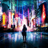 a silhouette of a person standing in the middle of a futuristic city at night. The scene is illuminated by neon lights, suggesting a modern and advanced