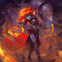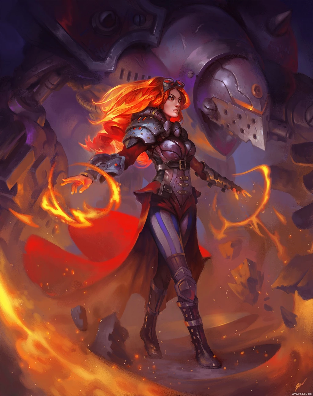 Картинка показывает женский персонаж, который, кажется, из фантастической обстановки. Она имеет рыжие волосы и одета в доспехи с замысловатыми рисунками, предполагая, что она может быть воином или авантюристом. За ней механические части, которые могут означать, что она сражается с роботизированным противником. На заднем плане изображено пламя, что добавляет драматического эффекта сцене.