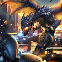 a futuristic cityscape at night, with a large dragon dominating the center of the frame. The dragon's scales are reflective, suggesting it might be made of some kind of armored material, and its wings are spread wide in what could be