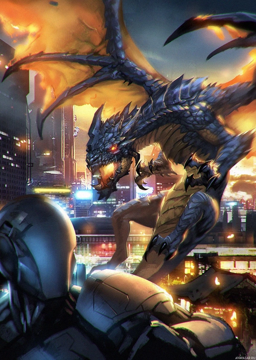 a mythical creature traditionally associated with fantasy and magic versus a technologically advanced being—creates a dynamic where old meets new, symbolizing perhaps the intersection of fantasy and technology, or the clash of different realms within the fantasy genre itself.