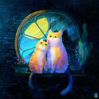 In this picture, there are two cats sitting on a windowsill. One cat is looking directly at the viewer with its eyes open wide, while the other cat has its eyes closed and appears to be looking down or away from the viewer. The background features